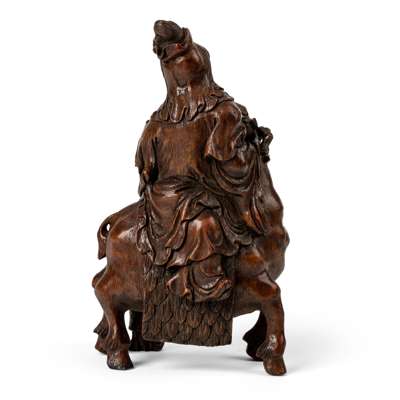 carved with the female immortal riding a deer, her left hand holding lingzhi fungus, right arm with a vase, the deer standing on all fours, its mouth further with a lingzhi fungus, turning back to an attendant presenting a cup on a tray
