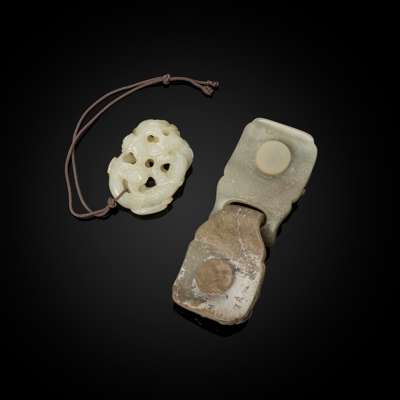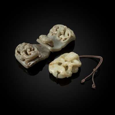 one celadon jade belt hook in two parts, each half carved in openwork with a sinuous chi-dragon; and one white jade reticulated pendant carved with a five-clawed dragon coiling its body amidst ruyi-head clouds