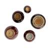 comprising: a small bottle vase, a spindle shaped vase, a hu-form vase, the bulbous jar, and a circular saucer with straight sides