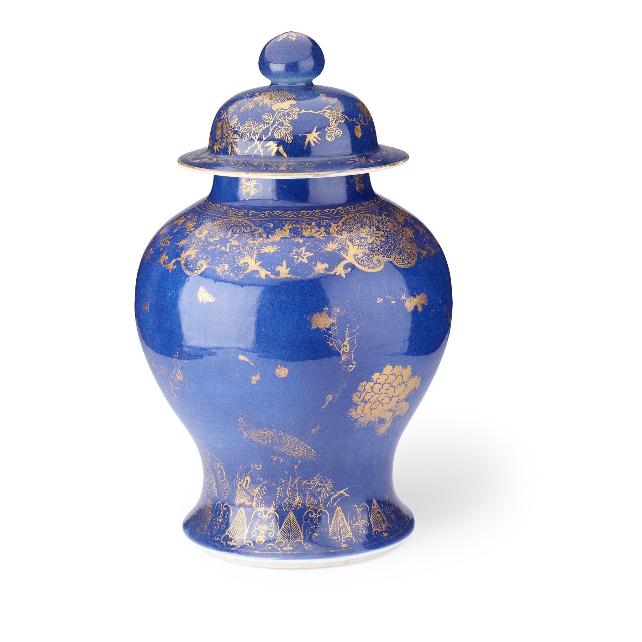 GILT-DECORATED POWDER-BLUE-GLAZED BALUSTER VASE WITH COVER