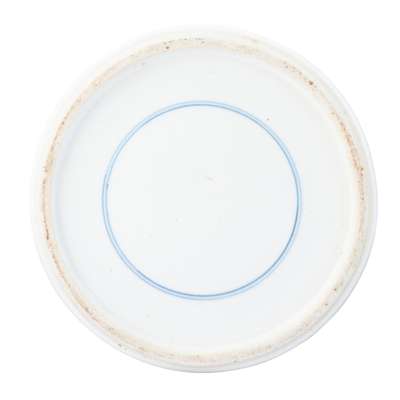 sturdily potted on a gently flared foot, raised to globular body and short straight mouth, painted in gilt with peony sprays and birds below a floral and bat collar, the domed cover similarly decorated and surmounted by a knob finial, the base painted with a double-circle in underglaze blue