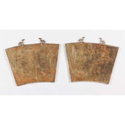 each of fan shape, one painted with two groups of three pomegranates borne on slender foliated scrolling tendrils, the other with luscious blossoming flowers, in gilded silver frames inset with beads and a pair of dragon handles