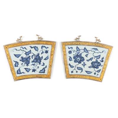 明 青花石榴及花卉紋瓷板 鑲鎏金嵌寶石銀框及雙龍掛勾
