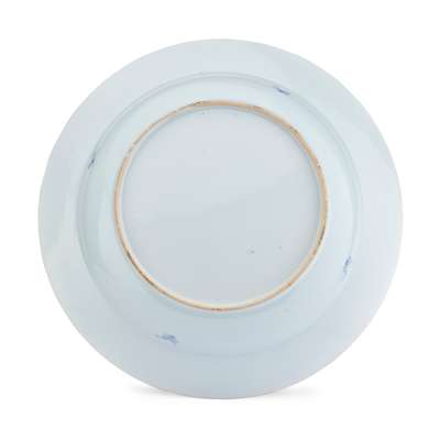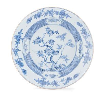well potted with wide everted rim, painted in the central medallion with Buddha's hand citrus borne on branches and bamboo groves, both issuing from rockwork, within a band with four bogu cartouches against a diaper ground, further with floral sprays on the cavetto, the exterior painted with small lingzhi fungus motif