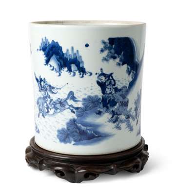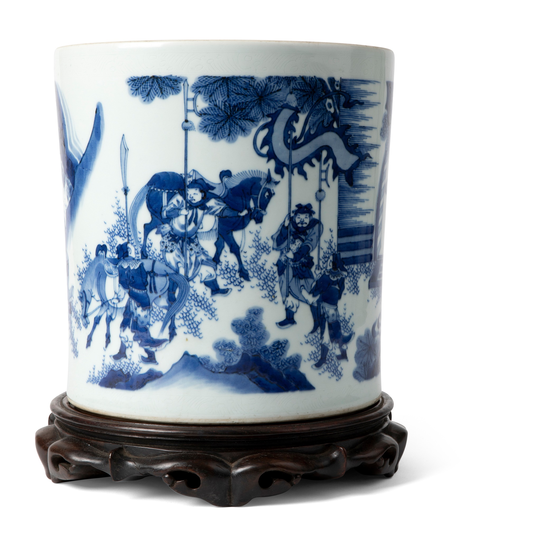 heavily potted, of characteristic cylindrical form, the exterior painted with soldiers and cavaliers in a landscape setting, the scene set between incised scroll bands, with a fitted wooden stand