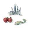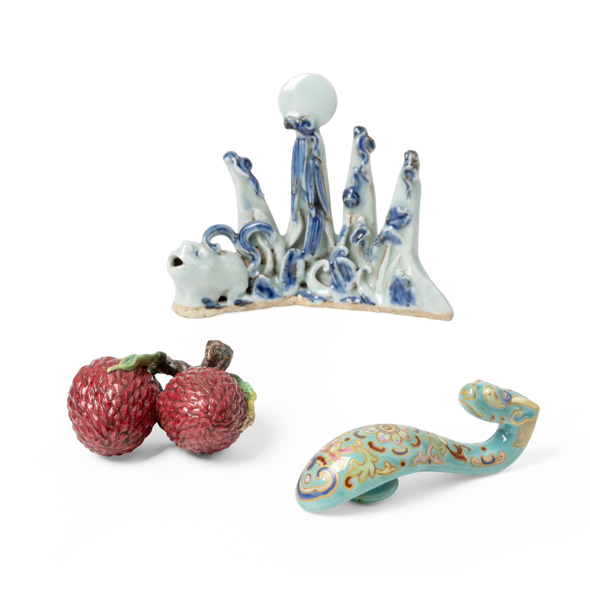 comprising: one blue and white mountain-form brush rest with four peaks, the highest peak topped with a full sun, the lower left adorned with a frog; one of naturalistically modelled and coloured double-lychee brush rest on a leafy branch; and one turquoise-ground famille rose belt-hook form brush rest with dragon head and painted with lotus and ruyi-head clouds