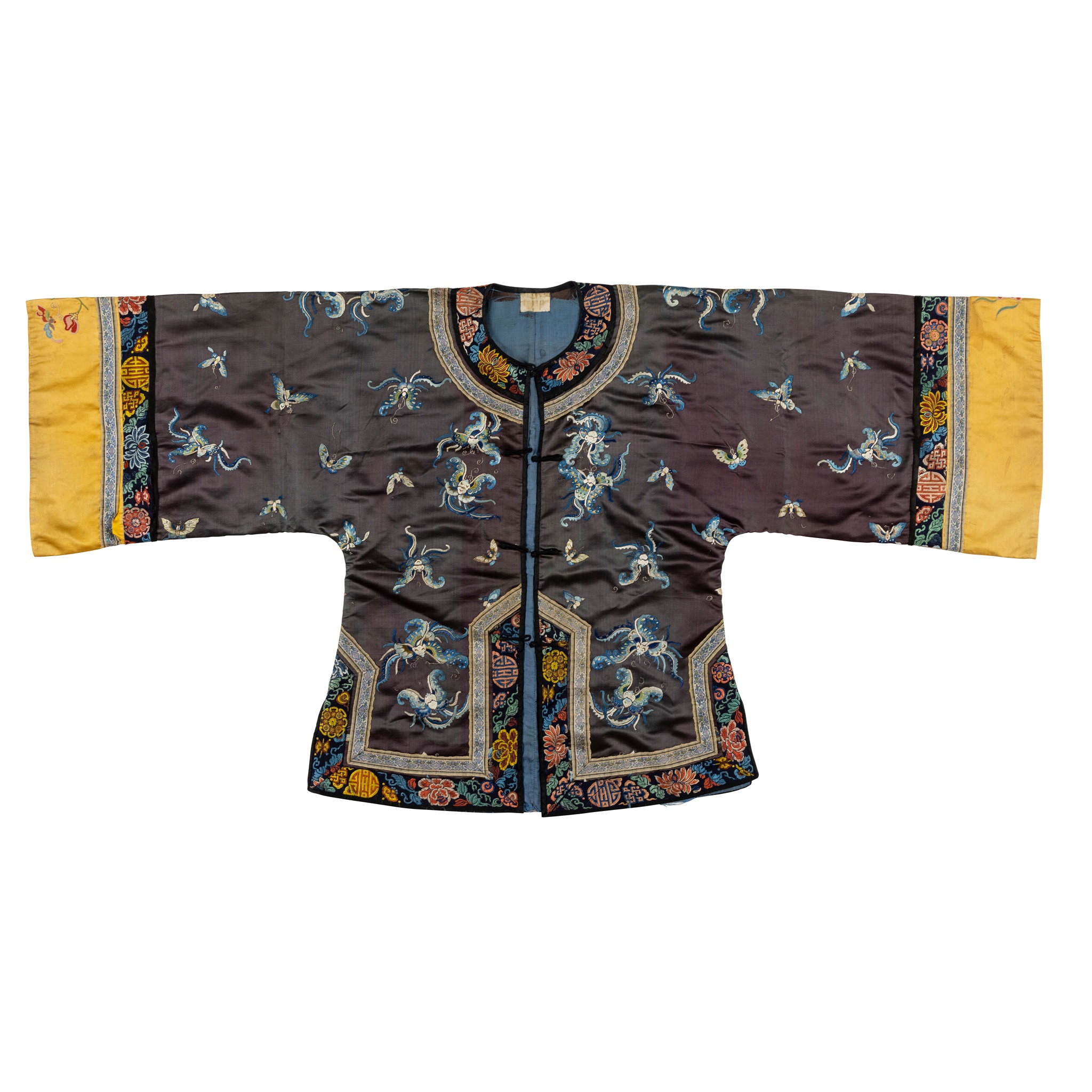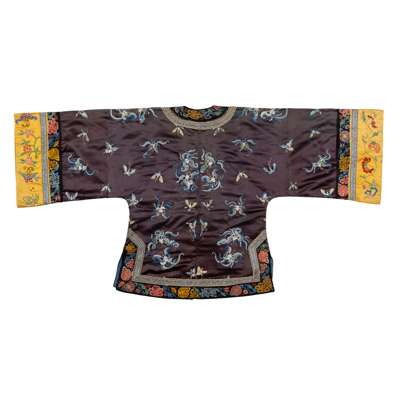 with long and wide sleeves, embroidered on a navy silk ground with 'one hundred butterflies' motif, flowers and 'shou' roundels decorating the hem