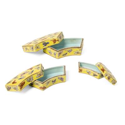 SET OF THREE YELLOW-GROUND FAMILLE ROSE 'BUTTERFLIES' FAN-SHAPED STACKING BOXES AND COVERS