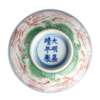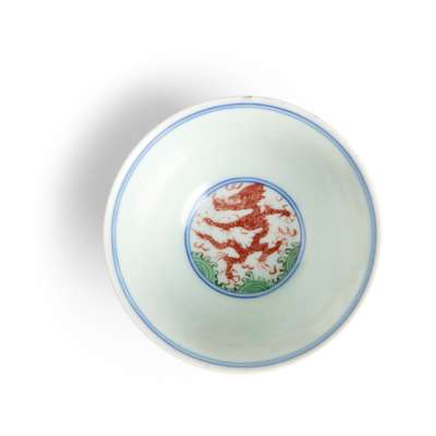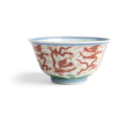 the deep rounded sides rising from a tapered foot, the exterior enamelled in iron-red with five-clawed dragons writhing sinuously above a band of tumultuous green waves, the interior similarly decorated with a medallion enclosing a further dragon soaring above green waves, the foot bordered in underglaze blue with a double-line band, the base inscribed with a six-character Jiajing mark within a double circle in underglaze blue