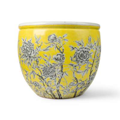 sturdily potted with rounded sides decorated in black grisaille with leafy peony branches issuing large blooms in various stages of growth against a bright yellow ground, the side inscribed with a four-character 'Ti He Dian Zhi' mark in iron red