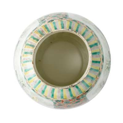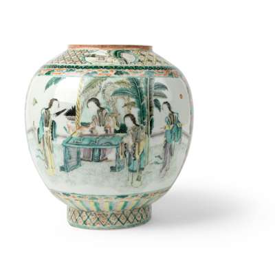thinly potted, the body finely painted on both sides with panels of four ladies in a garden under the moonlight against a floral and bamboo foliage ground, set between diaper-ground shoulders and foot