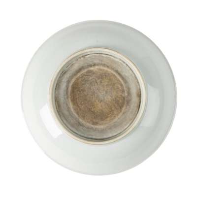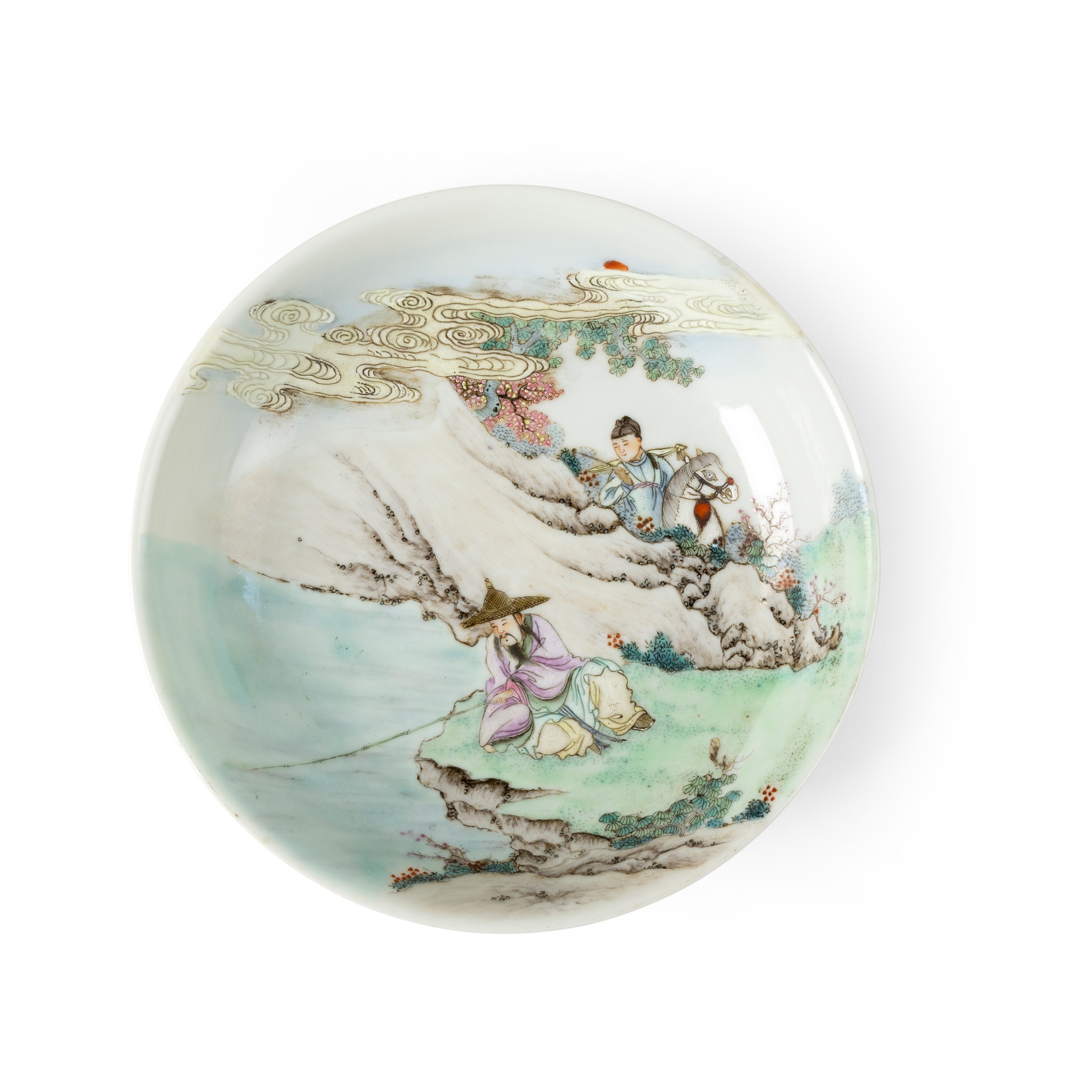supported on a short foot and terminating to an everted rim, the interior finely painted with a scholar riding on a horse just emerging behind the mountain and heading to a fishing hermit sitting by the river bank, with swirling clouds and sun hanging on the sky, the base unglazed