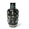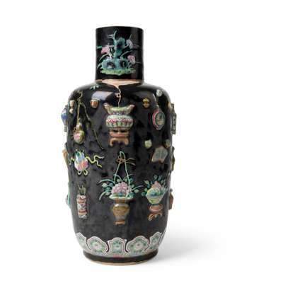 the body decorated with moulded 'Hundred Antiquities' in high relief, such as table screen, incense burners and scholar's desk objects, the neck further adorned with lingzhi fungus and rocks, all against a dark-green ground