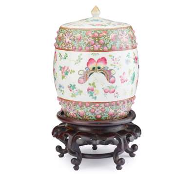 FAMILLE ROSE BARREL-FORM JAR WITH COVER