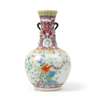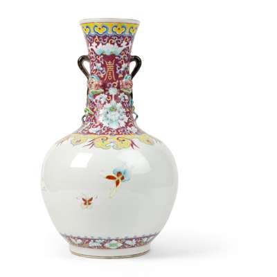 sturdily potted with a bulbous body raised to a waisted long neck, the body painted with blossoming chrysanthemum and prunus flowers with butterflies in flight, all below a yellow-ground ruyi-cloud band around the shoulder, the waisted neck adorned with bats and flowers on against a red ground, flanked by two branches of moulded pomegranates as handles, the base inscribed with a four-character Hongxian mark in iron-red