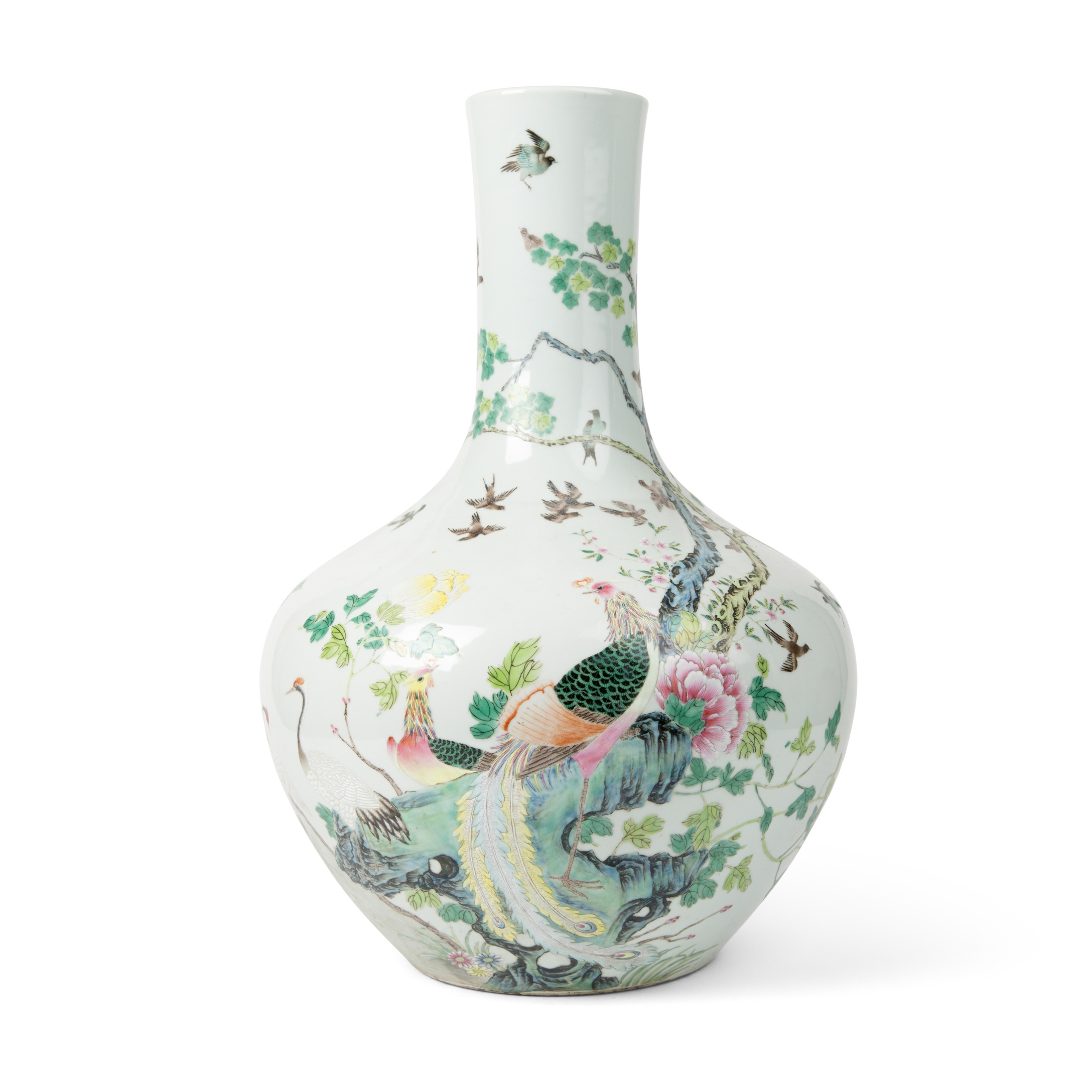 LARGE FAMILLE ROSE 'PHOENIXES' BOTTLE VASE