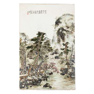 二十世紀 段子安款 淺絳彩《溪流樹色》瓷板