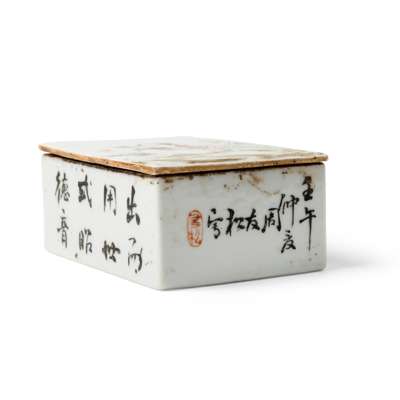 十九至二十世紀 周友松款 粉彩童子採菊長方形印泥盒