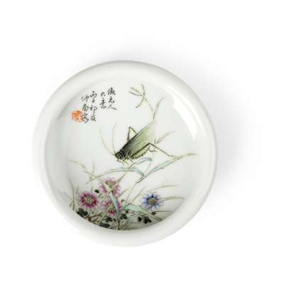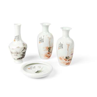 comprising: two small vases depicting a seated arhat surrounded by books and smoke from an incense burner, each respectively holding a rosary and a lingzhi fungus, with inscription and signed by 'Wu Ji Zhen', the base inscribed with 'Ji Zhen' mark in iron-red; one small vase painted in ink with large pine trees in mountainous landscape, signed 'Wang Ye Ting', the base with a seal mark in iron-red; and one lipped rim brush lick with a cricket on grass, with inscription and signed by 'Zhong Nan', the base with a seal mark in iron-red