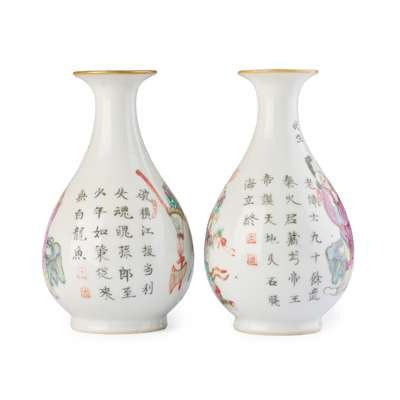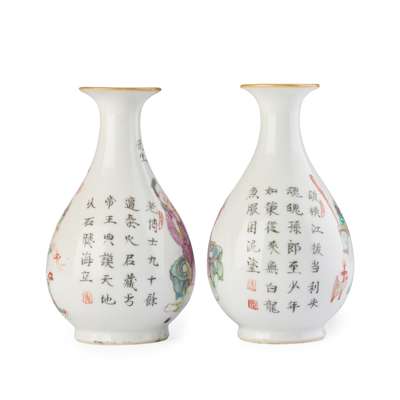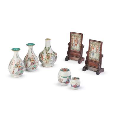 comprising: a pair of porcelain plaques mounted as table screens; a pair of 'Wushuangpu' vases; a bottle vase; and two gradual sized barrel-form lidded boxes
