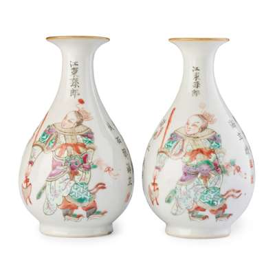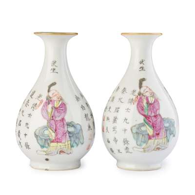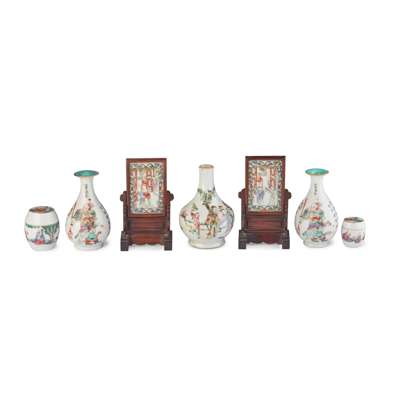清 粉彩袖珍人物紋桌屏、瓶、鼓式蓋盒 及 無雙譜圖對瓶(共七件)