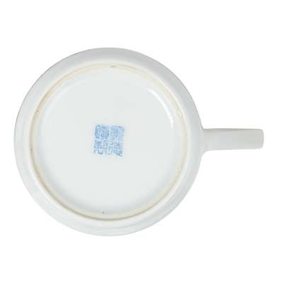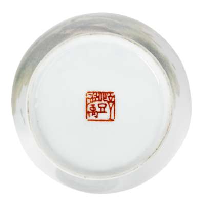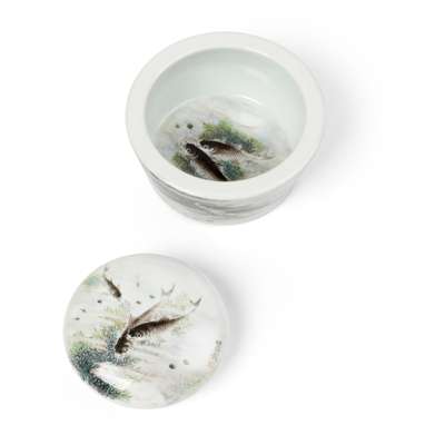 comprising: all seven pieces similarly decorated with carps amongst aquatic plants; including one baluster vase, thinly potted signed Deng Xiaoyu (1920-2000) and with the year of Ding Mao, corresponding to 1987, the base with the artist's seal; the other six items all signed Shi Huanying (1908-1968), including a circular covered seal paste box, a circular brush washer, a small cylindrical vase, and three handled coffee cups, each stamped with a blue 'Jing De Zhen Zhi' mark on the base