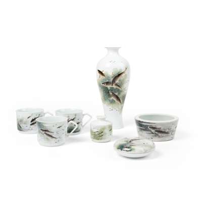 二十世紀 鄧肖禹款 粉彩魚藻紋瓶 及 時幻影款 圓蓋盒、筆洗、 小瓶及咖啡杯三件(共七件)