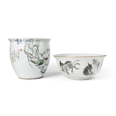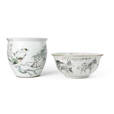 二十世紀 傅堯笙款 中國景德鎮製底款 墨彩群驢圖大盆 及 惠娟款 粉彩花鳥圖缸(共兩件)