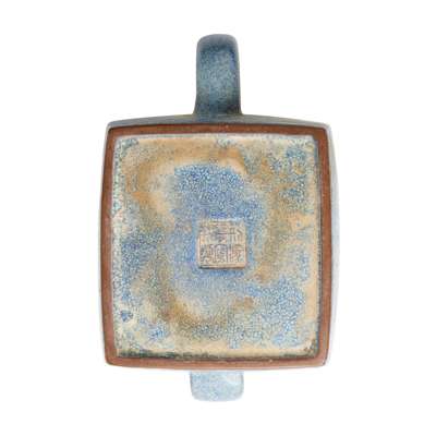 with a tall square body, both the body and the domed cover covered in a thick layer of Jun-glaze fused with light and dark blue colours, the interior and the foot rim revealing the original purplish clay body, the base with a six-character 'Jing Xi Hua Feng Xiang Zhi ' mark in archaic script