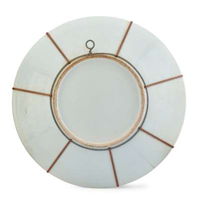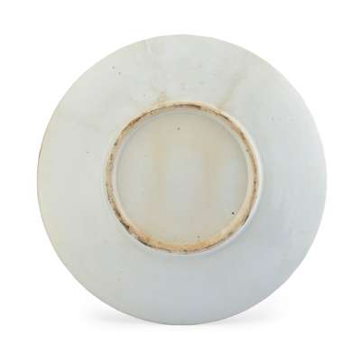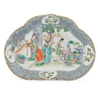 comprising: two gradual chargers, similarly painted with birds, butterflies and flowers; and one scalloped dish, enamelled with figures in the interior enclosed by dense floral ground