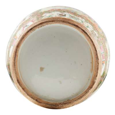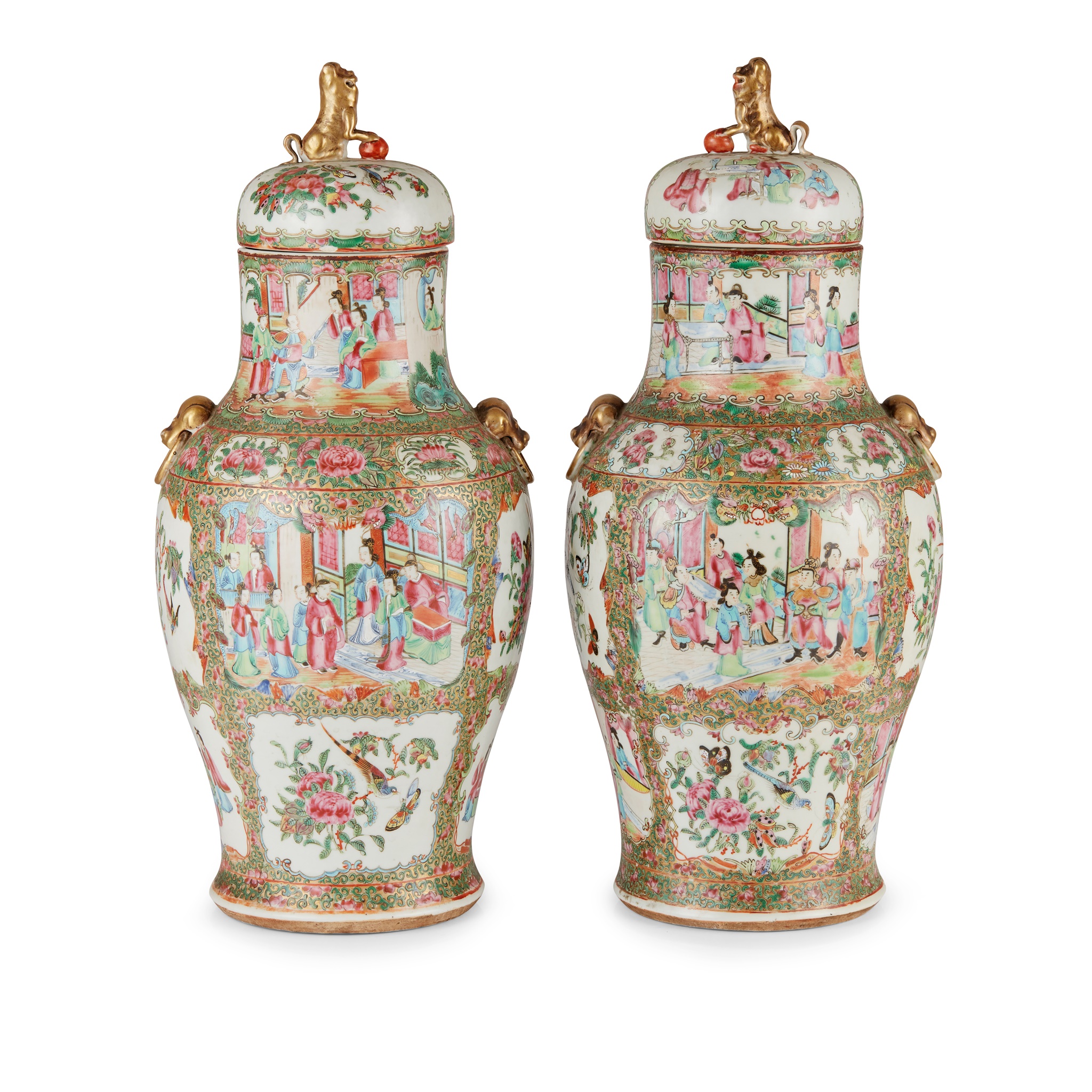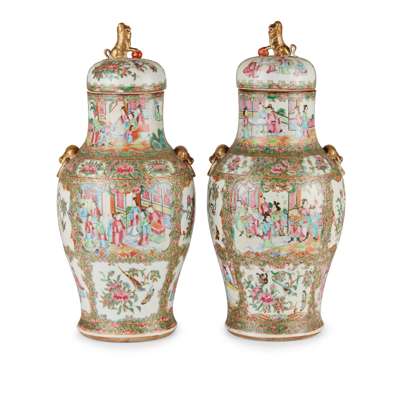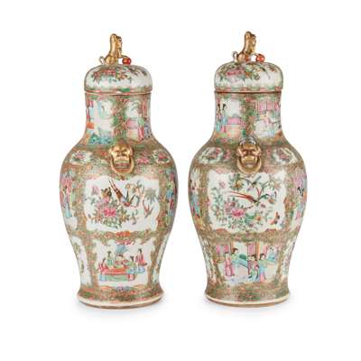 PAIR OF CANTON FAMILLE ROSE VASES WITH COVERS