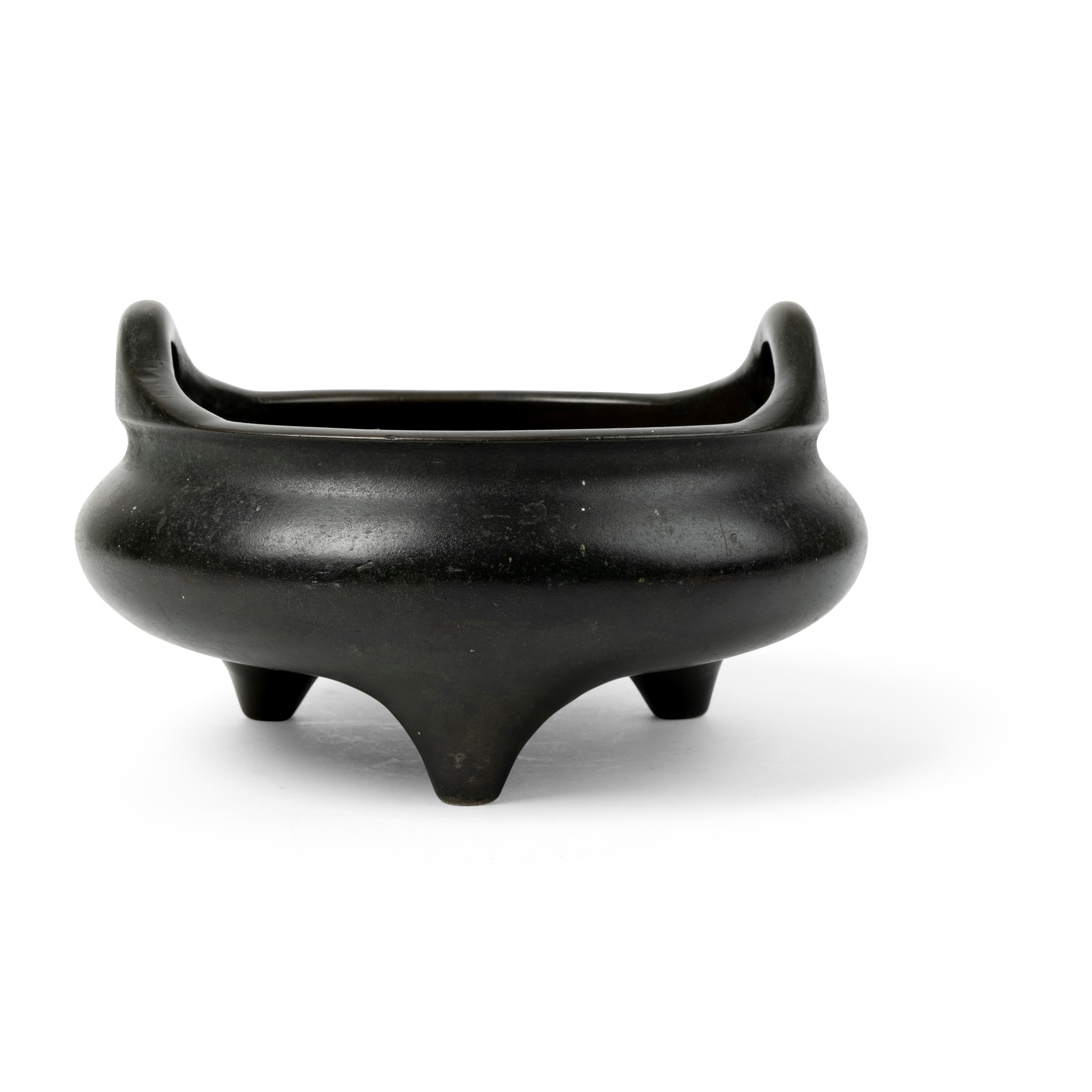 of compressed bulbous form supported on three short tapering feet, flanked by a pair of upward facing loop handles on the rim, the base with a six-character 'Xuan De Wu Nian Zhi Zao (Made in the Fifth Year of Xuande Reign)' in a recessed panel
