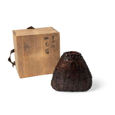 madake (timber bamboo); tobi-gozame-ami ('skipping' mat plaiting), twining, wrapping, fitted with a bamboo hanging loop; signed Chikuunsai tsukuru; with lacquered bamboo otoshi (water container) and a wood tomobako storage box titled Seigaiha kakehanakago ('Blue Ocean Waves' hanging flower basket), signed Tekisuikyo Chikuunsai tsukuru, and sealed Denri no in and Chikuunsai