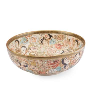 comprising: a big bowl richly painted inside and out with various no-men borne on strings, the base marked 'Kinkozan Zo'; a circular box and cover, finely painted with figures on the lid, interiors of box and cover with butterflies and phoenix, the base marked 'Yozan'; and a tapered triangular vase decorated with maple leaves, the base marked