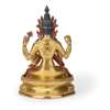 shown seated in padmasana, front hands in anjali mudra before the chest, back left hand holding a lotus stem and right in karana mudra, wearing a five-leaf crown surrounding a high chignon topped with a Buddha's head, heavily jewelled, a billowing scarf wrapped around his front hands rested sides of his thighs, the base sealed with plaque chased with double vajra