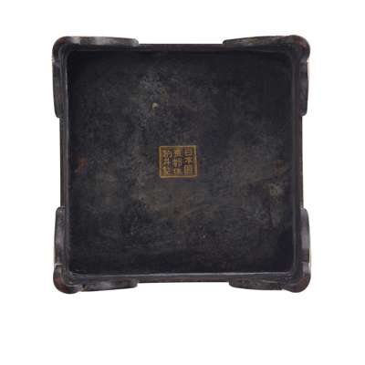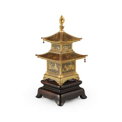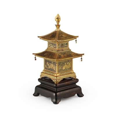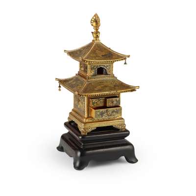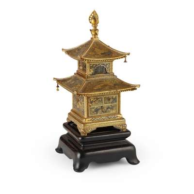 constructed in two removeable storeys raised on a stepped square base supported on four bracket feet, each storey constructed beneath a typically sloping roof fitted with hinged doors and drawers, both upper and lower roof decorated respectively with cranes, magpies, phoenix and peacocks in rural settings or seasonal flowers, surmounted by a tall stupa with a knop in the form of a flaming pearl, the roof's corners further adorned with suspending bells, the base signed Nihon Koku Kyoto ju Komai sei, with a fitted and stepped wooden stand