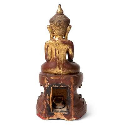 carved from a single block of wood, lacquered and gilt, seated upon a raised pedestal, his right hand in bhumisparsha mudra, the left resting on his lap, wearing samghati, his face with serene expression, elongated earlobes, curled hairdress and usnisha, the latter topped by a lotus bud, the back of the pedestal carved into a rectangular chamber with the content missing