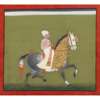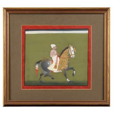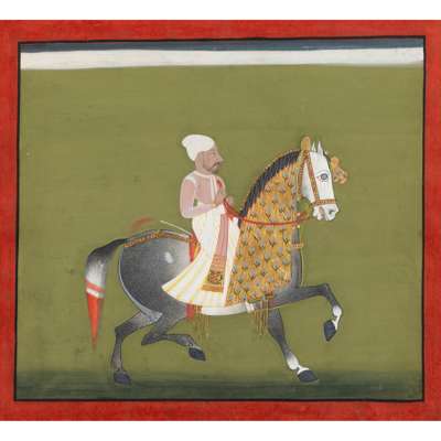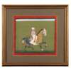 gouache on paper heightened in gold, the ruler depicted in a white robe, the horse’s mane bedecked in a luxurious gold covering with repeat floral designs, its tail painted in red and white, all against an olive green background