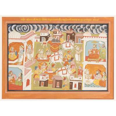 a folio from the Ramayana, gouache on paper, depicting a two-storey building on either side with baby Rama held in the arms of a priest in the upper left hand room, the central area featuring many bullock carts bearing gifts and valuables, inscribed in Devenagari above, mounted