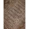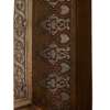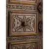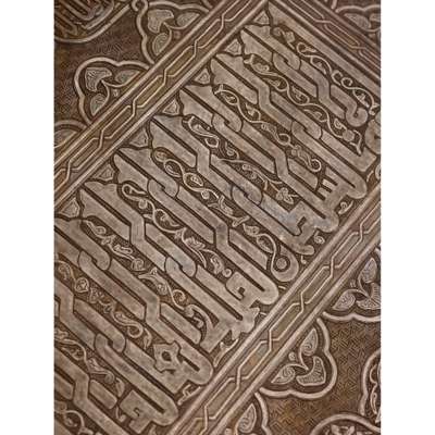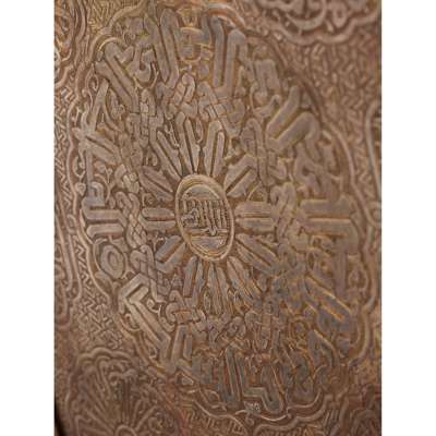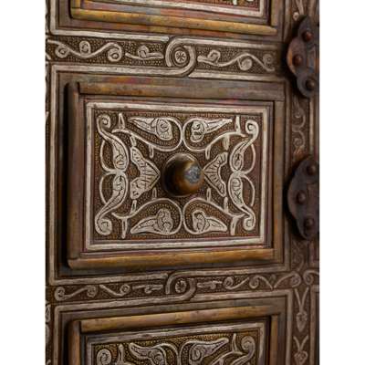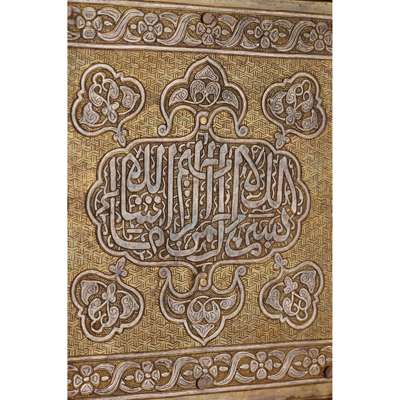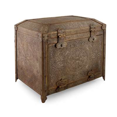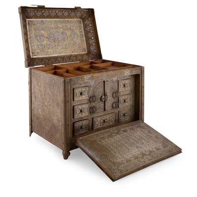 of rectangular form with a hinged sloping top lid and a front hinged lid, all sides profusely decorated with calligraphic roundels, cartouches with split palmettes and knotted calligraphy designs, all on a reserve of zig zag motifs, the sloping shoulders of the top lid decorated with a band of kufic calligraphy with leafy vines, border divisions comprising narrow bands of repeat leafy vines, the upper lid decorated on the inside with a large lobed calligraphic cartouche surrounded by trefoil motifs containing split palmettes, the interior revealing a wooden tray with nine compartments, the front cover lid decorated with elongated kufic calligraphy and further calligraphic cartouches on the inside and once opened revealing a set of seven drawers and a central arched cupboard, all decorated with split palmettes and zig zag motifs