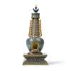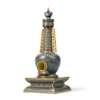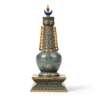 of Tibetan style, raised on a waisted square pedestal enamelled with lotus lappets, the dome-shaped stupa decorated with lotus and scrolling tendrils underneath a festoon of beads and a band of mythical beast heads, opening to a side with yellow-silk padded shrine set within arched niche and lotus throne, raised to a fifteen-wheeled spire and parasol, topped with a hardstone-inlaid sun-moon finial and pinnacle