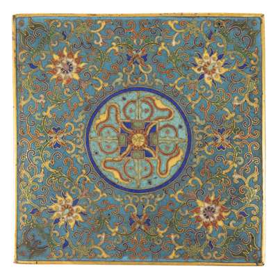 Note: Compare to a larger cloisonné enamel stupa, 66.6cm high, dated to Qianlong period, with circular stepped pedestal with steps leading towards the shrine, in the collection of the Freer Gallery of Art, accession no. F1991.6; Also see a pair of cloisonné enamel stupa, 18th-19th century, offered at Sotheby's New York, 16 March 2016, lot 328, note the similarity of the mythical beast heads and festoon bands on the globular bumpa; See another larger and more elaborate example, dated to Qianlong period, in the collection of the Met Museum, accession no. 33.40.67.