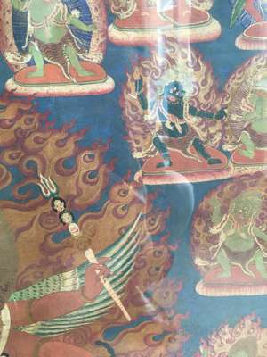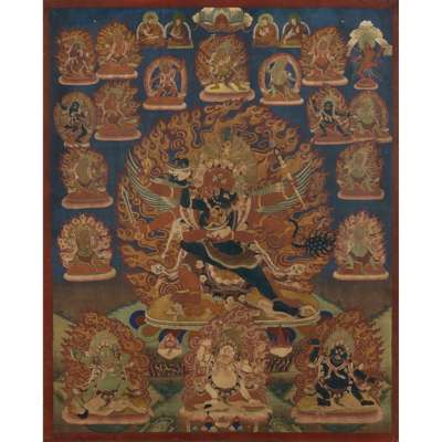 distemper on cloth, the wrathful incarnation of Padmasambhava depicted striding in alidhasana on two corpses and lotus throne, six hands holding attributes, including a vajra and vajra sword- khadga rising on left, a trisula khatvanga and scorpion on right, a kartika chopper and kapala before his consort wrapped around by two arms, the wrathful blue consort embracing the Lord with the left leg while holding aloft a set of kartika chopper and kapala, a pair of wings wide-spread before the flaming mandorla, flared elephant and tiger skins wrapped around his body, garlands of heads and skulls hanging between legs, enclosed by further wrathful protectors