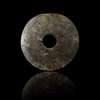 of conventional form, the thick bi disc with small central aperture drilled from both sides, the inner walls with remains of pronounced cutting ridges, the dark green stone suffused with a network of brown and buff-coloured alteration on one side