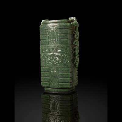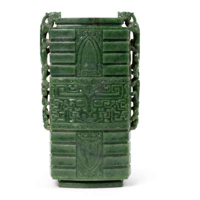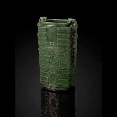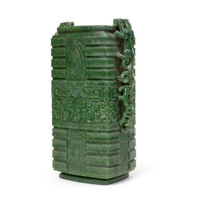 Note: The use of fanggu mark, meaning 'imitating antiquity', was used during the Qianlong reign on archaistic jade vessels. The present lot with its archaic jade inspired cong form and design of taotie mask embodies the artistic pursuit of fanggu. Compare a related archaistic spinach green jade square gu vase and a gong vessel with chi-dragon decoration, both with Qianlong fanggu mark and of the period, from the Qing Court Collection, are in the National Palace Museum, Taipei, museum number Gu Yu 故玉248 and 732.