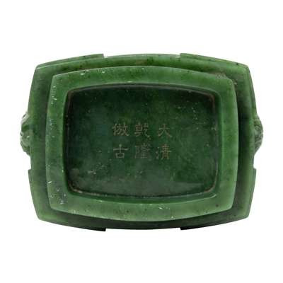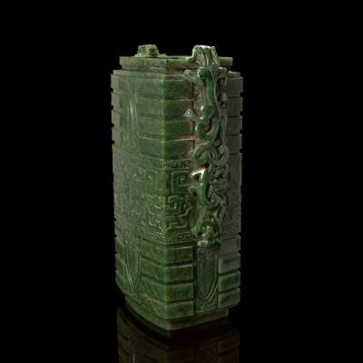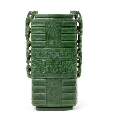 carved as rectangular cong form, supported on a short splayed foot, the sides subdivided into three mains sections, the middle section carved in low relief with stylised taotie head with large horns, the upper and lower section further incised decorated with a cicada motif flanked by four horizontal divisions, either side of the vase carved with two sets of tree entangling chi-dragons in openwork as handles, the base inscribed with a six-character 'Da Qing Qianlong Fanggu (Made in imitation of antiquity in the Qianlong reign of the Great Qing dynasty)', the stone of dark spinach-green tone with some black inclusions