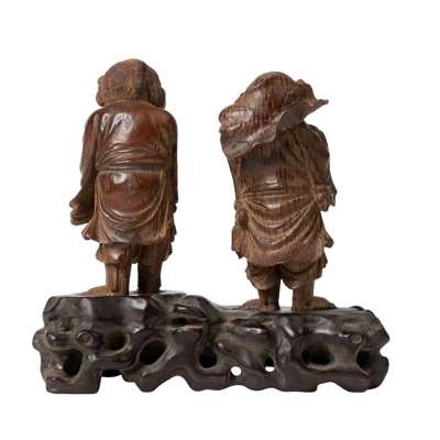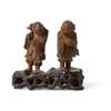 finely carved as the mythical immortal twins, the right one holding a round wicker box, the other holding a lotus spray in his right hand issuing a large leaf and blossom behind his shoulder, both figures depicted with playful faces and standing on a fitted pierced carved wooden stand