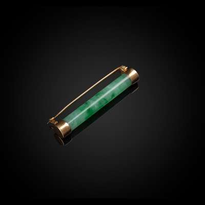of tubular shape, the stone of transparent bright green colour with white streaks, later mounted with gold coloured metal pin to form a brooch