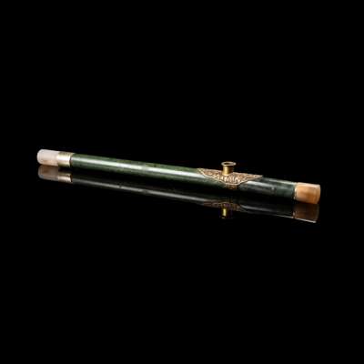 the cylindrical shaft in plain form with metal mount, inset both ends with agate mouthpiece, the stone of luscious rich green tone with variegated dark streaks