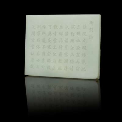 carved on one side with orchids issuing from the cracks on cliffs, hanging over river streams and rugged rocks, the reverse carved with a corresponding Imperial poem, the stone of even white colour